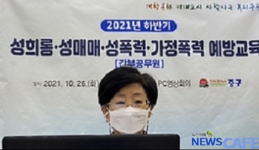 [뉴스카페]인천 중구(구청장 홍인성)는 지난 26일 중구청 간부공무원을 대상으로 ‘2021년 하반기 4대폭력(성희롱·성매매·성폭력·가정폭력) 예방교육’을 실시했다.