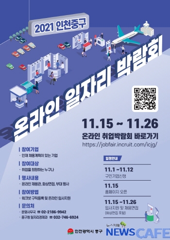 [뉴스카페]인천 중구는 오는 15일부터 26일까지 코로나19로 고용 위기를 겪고 있는 구직자와 구인기업을 대상으로‘2021 중구 온라인 일자리박람회’를 개최한다.