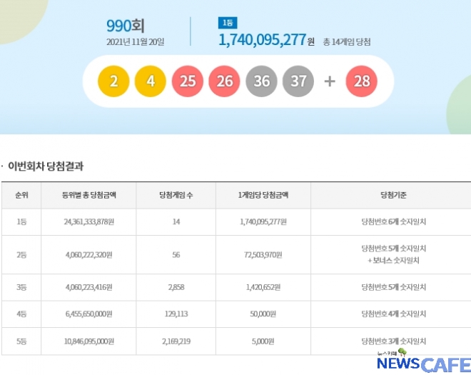 [뉴스카페]20일 추첨한 동행복권 990회 로또6/45 1등 당첨자는 14명으로 1인당 17억4,009만원씩의 당첨금을 받는다.