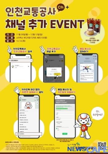 [뉴스카페]인천교통공사(사장 정희윤)는 인천교통공사 공식 카카오톡 플러스 채널 홍보를 위해 ‘카카오톡 채널 추가 이벤트’를 29일부터 실시한다고 밝혔다.