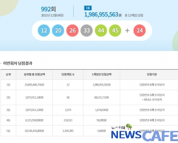 [뉴스카페]4일 추첨한 동행복권 992회 로또6/45 1등 당첨자는 12명으로 1인당 19억8,695만원씩의 당첨금을 받는다.
