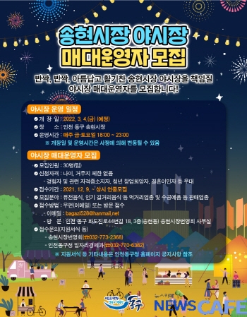 [뉴스카페] 인천 동구(구청장 허인환)가 내년 3월 개장을 앞두고 있는 송현시장 야시장 매대운영자를 모집한다.