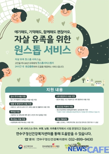[뉴스카페]인천 연수구는 갑작스러운 가족 및 친지의 자살로 인해 어려움을 겪고 있는 유족을 대상으로 애도 상담과 자살유족의 특성에 맞는 원스톱 서비스 사업을 실시하고 있다.