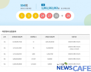 [뉴스카페]18일 추첨한 동행복권 994회 로또6/45 1등 당첨자는 12명으로 1인당 18억6,158만원씩의 당첨금을 받는다.