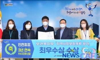 [뉴스카페]인천 연수구가 올해 보건복지부 주관 지역사회보장계획 2020년도 시행 평가에서 전국 기초단체 최우수상을 수상하며 3년 연속 지역사회보장계획 우수기관의 영예를 안았다.
