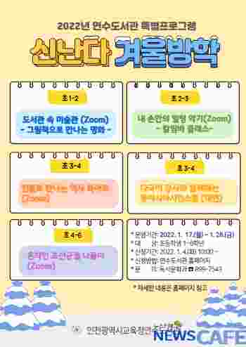 [뉴스카페]인천광역시교육청연수도서관(관장 김용석)은 겨울방학을 맞아 지역의 초등학생들에게 즐겁고 유익한 학습 경험의 기회를 제공하기 위하여 1월 17일부터 28일까지 '신난다, 겨울방학'을 운영한다.