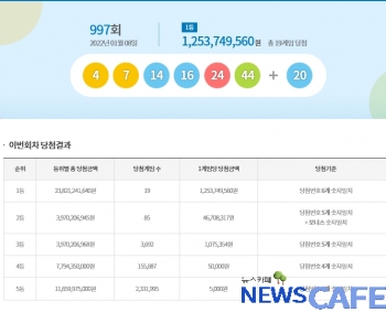 [뉴스카페]8일 추첨한 동행복권 997회 로또6/45 1등 당첨자는 19명으로 1인당 12억5,374만원씩의 당첨금을 받는다.