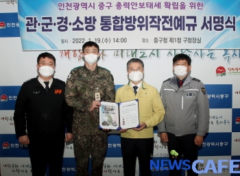 [뉴스카페]인천 중구(구청장 홍인성)는 지난 19일 제1청 구청장실에서 중구청, 7873부대 2대대, 중부경찰서, 중부소방서 각 기관장이 참석한 가운데 총력안보태세 확립 차원에서 통합방위작전예규 발간을 위한 합동 서명식을 가졌다.