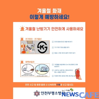 [뉴스카페]인천 부평소방서(서장 김기영)는 동절기 한파 및 코로나19로 인해 실내 활동이 증가함에 따라 화재위험 3대 난방용품 안전사용을 당부한다고 밝혔다.