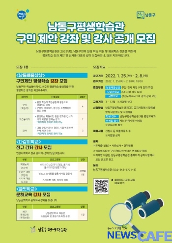 [뉴스카페]인천시 남동구 평생학습관은 구민 주도의 평생학습 활성화를 위해 구민 제안 강좌 및 강사를 공개 모집한다고 3일 밝혔다.