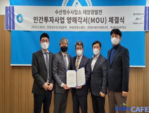 [뉴스카페]인천광역시는 수산정수장 태양광발전임대사업 공모에서 우선협상자로 선정된 ㈜원광에스앤티, ㈜제이에이치에너지, ㈜세아네트웍스 컨소시엄과 그린뉴딜 정책사업의 일환인 태양광 발전사업 추진을 위한 업무협약을 체결했다고 9일 밝혔다.