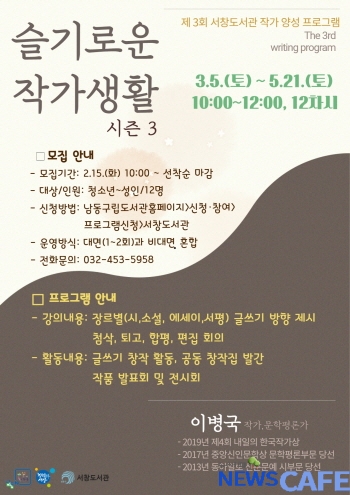 [뉴스카페]인천시 남동구 서창도서관은 다음 달 5일부터 글쓰기 프로젝트인 '지역작가 양성 프로그램-슬기로운 작가 생활:시즌 3'을 진행한다고 11일 밝혔다.