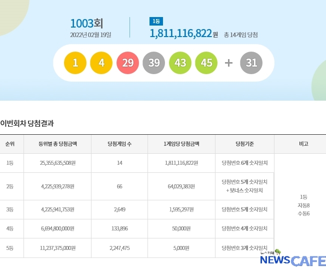 [뉴스카페]19일 추첨한 동행복권 1003회 로또6/45 1등 당첨자는 14명으로 1인당 18억1,111만원씩의 당첨금을 받는다.