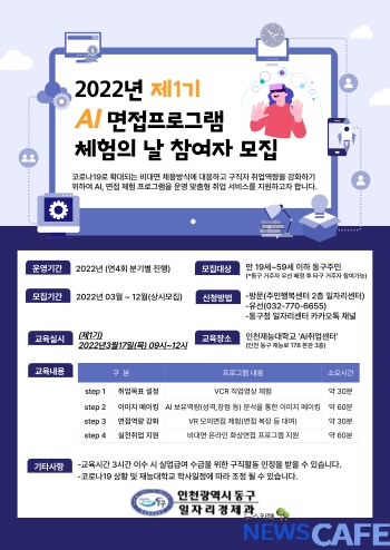 [뉴스카페] 인천 동구(구청장 허인환)가 코로나19 이후 변화된 비대면 채용방식 대응과 구직자 취업역량을 강화하기 위한 ‘AI 면접 프로그램 체험의 날’ 취업특강 참여자를 모집한다.