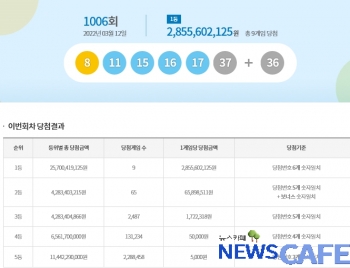 [뉴스카페]12일 추첨한 동행복권 1006회 로또6/45 1등 당첨자는 9명으로 1인당 28억5,560만원씩의 당첨금을 받는다.
