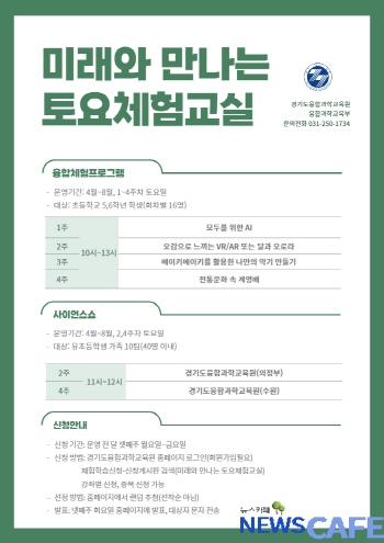 [뉴스카페]경기도융합과학교육원(원장 이태헌)이 오는 14일부터 18일까지 초등학생을 대상으로 4월에 운영하는 ‘미래와 만나는 토요체험교실’에 참가할 학생을 모집한다.