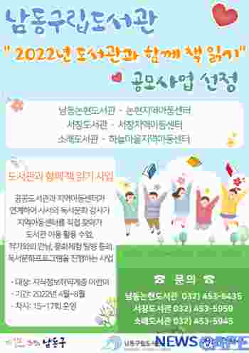 [뉴스카페]인천시 남동구는 남동논현도서관, 서창도서관, 소래도서관이 국립어린이청소년도서관 주관 ‘2022년 도서관과 함께 책 읽기’ 공모사업에 선정됐다고 22일 밝혔다.