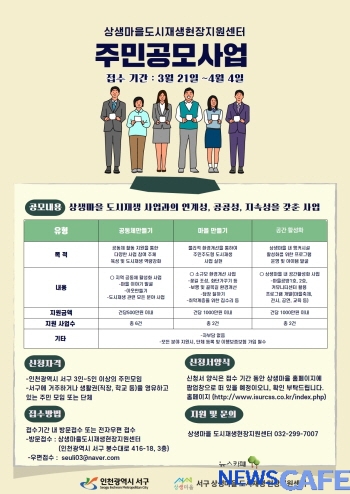 [뉴스카페] 인천 서구(구청장 이재현)가 다음 달 4일까지 상생마을 공동체 활동을 지원하는 ‘2022년 상생마을 도시재생 주민공모 사업’ 참여자를 모집한다고 25일 밝혔다.