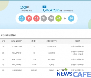 [뉴스카페]2일 추첨한 동행복권 1009회 로또6/45 1등 당첨자는 15명으로 1인당 17억246만원씩의 당첨금을 받는다.