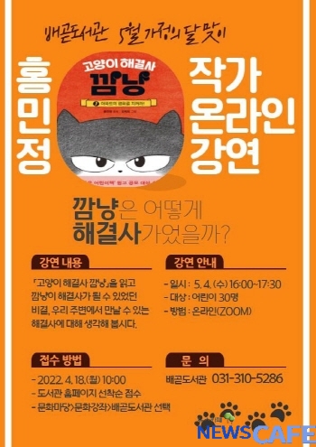 [뉴스카페]시흥시 배곧도서관은 5월 가정의 달을 맞아, '고양이 해결사 깜냥'의 홍민정 작가와의 만남을 온라인으로 운영해 시민들에게 독서의 즐거움을 선사한다.