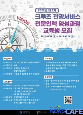 [뉴스카페]인천항만공사(사장 최준욱)는 포스트 코로나 시대를 대비한 인천지역 크루즈 관광산업 활성화와 전문가 양성을 위해 ’제3기 크루즈 관광서비스 인력양성 과정‘ 교육생 총 40명을 내달 24일까지 모집한다고 17일 밝혔다.