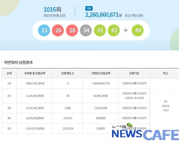 [뉴스카페]21일 추첨한 동행복권 1016회 로또6/45 1등 당첨자는11명으로 1인당 22억6,066만원씩의 당첨금을 받는다.