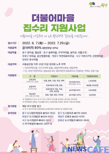 [뉴스카페]인천 부평구가 오는 6월 7일부터 7월 29일까지 원도심 저층 주거지 내 양질의 주거환경 조성을 위한 ‘2022년 더불어 마을 집수리 지원 사업’ 신청을 접수받는다.