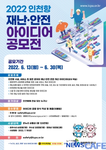 [뉴스카페]인천항만공사(www.icpa.or.kr, 사장 최준욱)는 인천항 이용자의 시각에서 안전 개선 과제를 발굴하기 위해 ‘2022년 인천항 재난·안전 아이디어 공모전’을 개최한다고 12일 밝혔다.