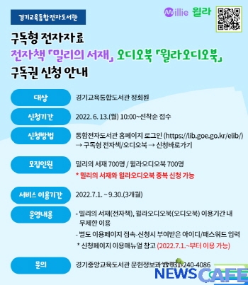 [뉴스카페]경기중앙교육도서관(관장 신창승)이 13일부터 경기교육통합도서관 정회원을 대상으로 ‘구독형 전자책과 오디오북 서비스’ 신청을 받는다.