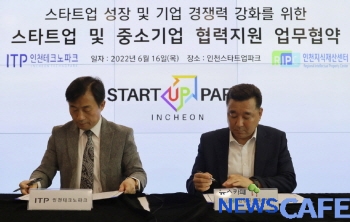 [뉴스카페]인천테크노파크(인천TP)와 인천지식재산센터는 16일 오후 송도국제도시 인천스타트업파크 인스타Ⅰ 6층 커넥트홀에서 스타트업(신생 벤처기업) 및 중소기업 협력 지원을 위한 업무협약(MOU)을 맺었다.