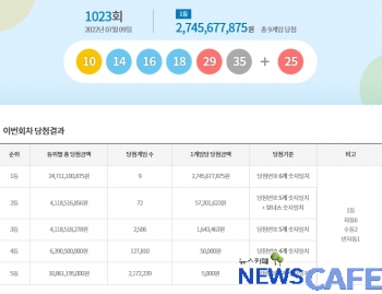 [뉴스카페]9일 추첨한 동행복권 1023회 로또6/45 1등 당첨자는 9명으로 1인당 27억4,567만원씩의 당첨금을 받는다.