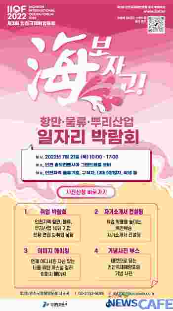 [뉴스카페]인천항만공사(www.icpa.or.kr, 사장 최준욱)는 제3회 인천국제해양포럼(Incheon International Ocean Forum 2022, IIOF 2022) 개막에 맞춰 21일 송도컨벤시아 그랜드볼룸A홀에서 ‘2022 All Logistics Incheon 물류산업 토크콘서트’ 및 ‘항만‧물류‧뿌리산업 일자리 박람회’를 개최한다고 13일 밝혔다.