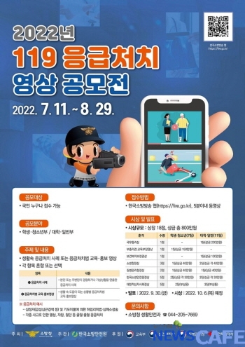 소방청이 주최하고 한국소방안전원이 주관하는 이번 공모전은 생활 속 응급처치 사례 또는 응급처치법에 관련된 5분 이내의 홍보영상을 공모한다.
