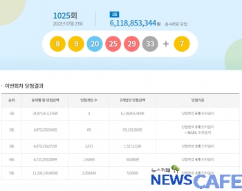 [뉴스카페]23일 추첨한 동행복권 1025회 로또6/45 1등 당첨자는 4명으로 1인당 61억1,885만원씩의 당첨금을 받는다.