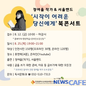 [뉴스카페] 인천광역시교육청부평도서관(관장 이정기)은 오는25일 오후 7시에 정여울 작가와 서율밴드의 ‘시작이 어려운 당신에게’ 북콘서트를 운영한다.