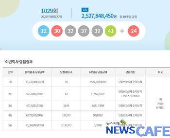 [뉴스카페]20일 추첨한 동행복권 1029회 로또6/45 1등 당첨자는 10명으로 1인당 25억2,784만원씩의 당첨금을 받는다.