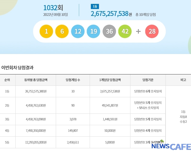 [뉴스카페]10일 추첨한 동행복권 1032회 로또6/45 1등 당첨자는 10명으로 1인당 26억7,525만원씩의 당첨금을 받는다.