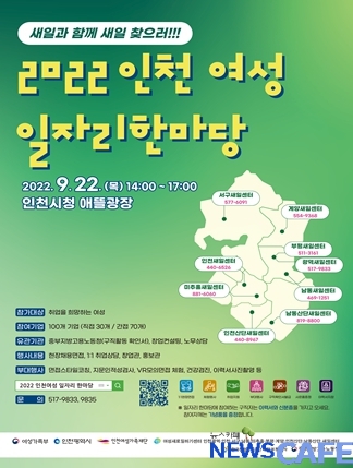 [여성종합뉴스]인천광역시(시장 유정복)는 경력단절여성 등 여성구직자들에게 취ㆍ창업 기회를 제공하는 ‘2022 인천여성 일자리 한마당’을 오는 22일 오후 2시부터 5시까지 인천시청 애뜰광장에서 개최한다고 밝혔다.