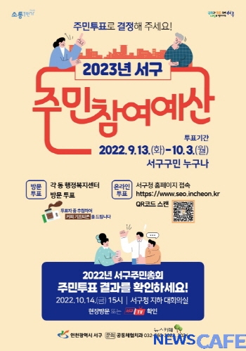 [뉴스카페] 인천 서구(구청장 강범석)가 내년도 주민참여예산 사업 선정을 위한 주민투표에 나선다. 구는 예산편성에 주민 참여를 보장하고 재정 운영의 투명성을 제고하고자 다음 달 3일까지 약 3주 동안 주민투표를 진행한다고 15일 밝혔다.
