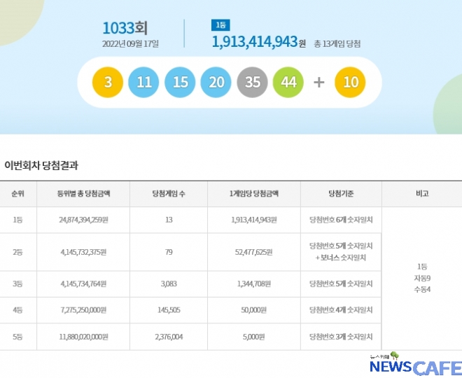 [뉴스카페]17일 추첨한 동행복권 1033회 로또6/45 1등 당첨자는 13명으로 1인당 19억1,341만원씩의 당첨금을 받는다.