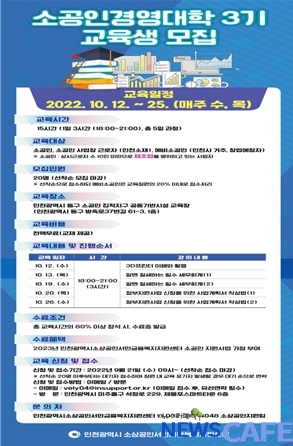 [뉴스카페]인천광역시(시장 유정복)는 인천 소상공인 서민금융복지지원센터에서 10월 12일부터 26일까지 2주간 소공인의 역량 강화를 위한 ‘2022년도 소공인 경영대학 3기’ 교육을 실시한다고 밝혔다.