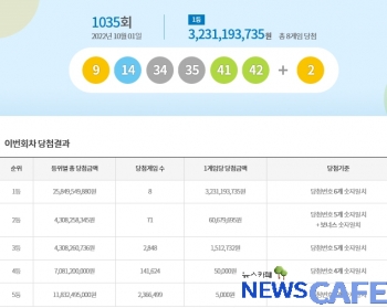 [뉴스카페]1일 추첨한 동행복권 1035회 로또6/45 1등 당첨자는 8명으로 1인당 32억3,119만원씩의 당첨금을 받는다.