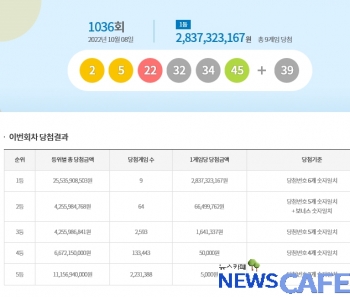 [뉴스카페]8일 추첨한 동행복권 1036회 로또6/45 1등 당첨자는 9명으로 1인당 28억3,732만원씩의 당첨금을 받는다.