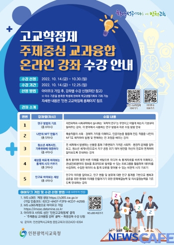 [뉴스카페]인천광역시교육청(교육감 도성훈)은 고교학점제 단계적 이행 및 학교 자율적 교육과정 운영 지원을 위해 12월 25일까지 ‘고교학점제 주제 중심 교과융합 온라인 강좌’를 운영한다.