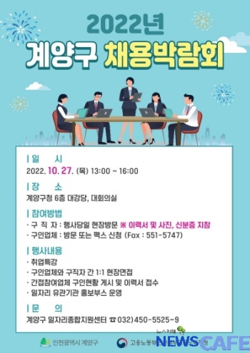 [뉴스카페]인천광역시 계양구(구청장 윤환)는 오는 27일 구청 대회의실과 대강당에서 ‘2022 채용박람회’를 개최한다고 21일 밝혔다.