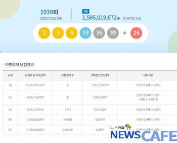 [뉴스카페]29일 추첨한 동행복권 1039회 로또6/45 1등 당첨자는 16명으로 1인당 15억8,501만원씩의 당첨금을 받는다.