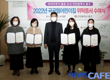 [뉴스카페]인천 중구(구청장 김정헌)는 지난 4일 중구 제1청 구청장실에서 변경위탁 대상인 갈매기, 비둘기어린이집과 민간어린이집에서 국공립으로 전환되는 신규 국공립어린이집 (가칭)아이숲, (가칭)우미파크 어린이집 2개소의 위탁운영자에 대해 국공립어린이집 위탁계약 증서를 수여했다.