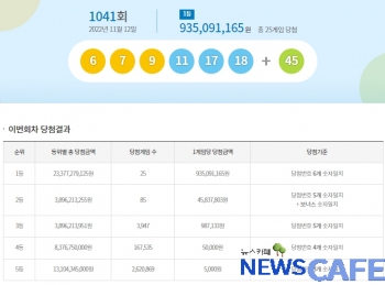 [뉴스카페]12일 추첨한 동행복권 1041회 로또6/45 1등 당첨자는 25명으로 1인당9억3,509만원씩의 당첨금을 받는다.
