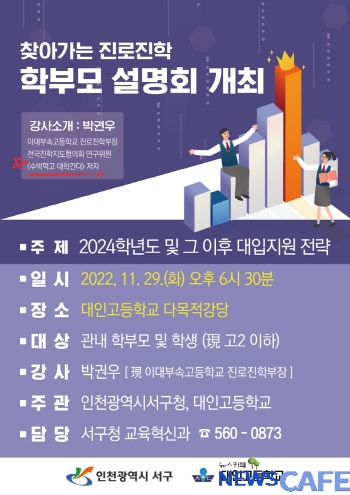 [뉴스카페] 인천 서구(구청장 강범석)가 ‘찾아가는 진로․진학 학부모 설명회’를 오는 29일 대인고등학교 다목적 강당에서 개최한다.