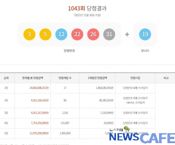 [뉴스카페]26일 추첨한 동행복권 1043회 로또6/45 1등 당첨자는 17명으로 1인당 14억6,864만원씩의 당첨금을 받는다.